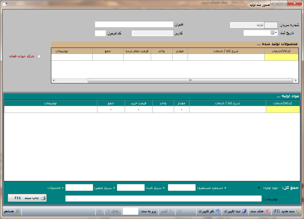 • صدور سند تولید ( فرموله یا دستی ) بهمراه هزینه تولید